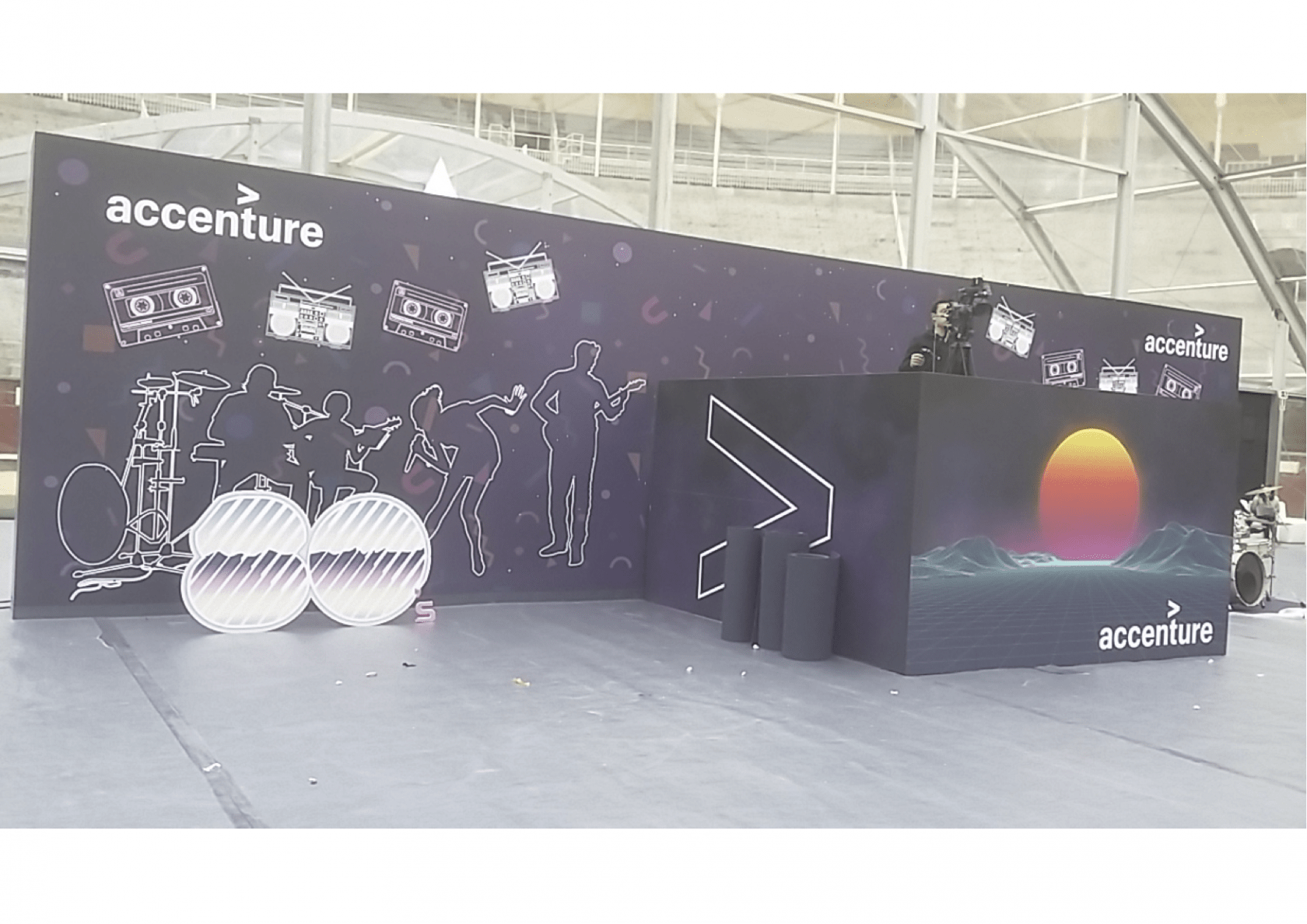 Nuestros directores artísticos se encargaron de dar forma y ensayar con el elenco de Accenture, coreografías, canciones, coros e incluso los arreglos musicales originales de algunos temas, con los que algunos empleados nos sorprendieron tocando en directo. A la vez nos encargamos del conjunto de la puesta en escena del evento para transformar las Ventas en un gran escenario, donde desde el inicio de la fiesta los invitados se vieron inmersos en el ambiente de la década de los ochenta madrileños.